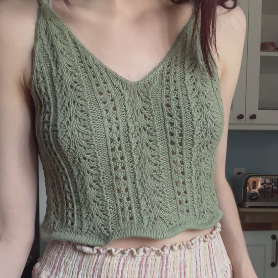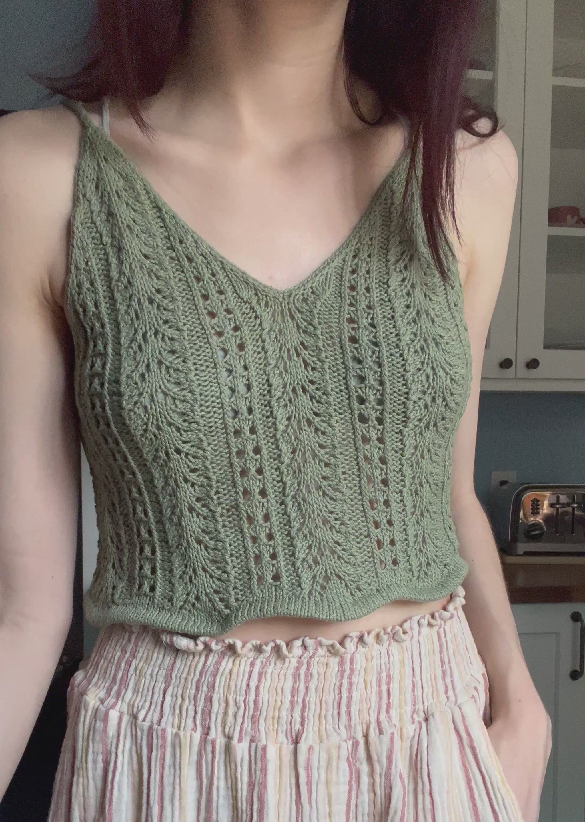 The Astraea Top is a lace knit tank top perfect for a warm spring day and the summer sun. Named after the star maiden goddess of divine justice, this design features two intricate repeating lace motifs across the entire piece, a scalloped crochet edge and a delicate picot hem. This pattern is highly customizable to your unique preferences and needs, with options for an open front, closed front top, or bralette, with numerous options for the hem and edge details to match your style. The construction of this top is knit top down by working two front panels and connecting them by casting on stitches for the back with the option to work flat or in the round for an open front or closed front, respectively. The hem is worked once the desired length of the body has been reached. The straps are picked up along the front panel cast on edge and double knit to your preferred length and seamed to the back. Finally, the optional crochet edge is worked along your preferred edges - the button band, front panel edges, and back cast on edge. Modification options for fit adjustment, length adjustment, strap width, and different yarn weights are included.
