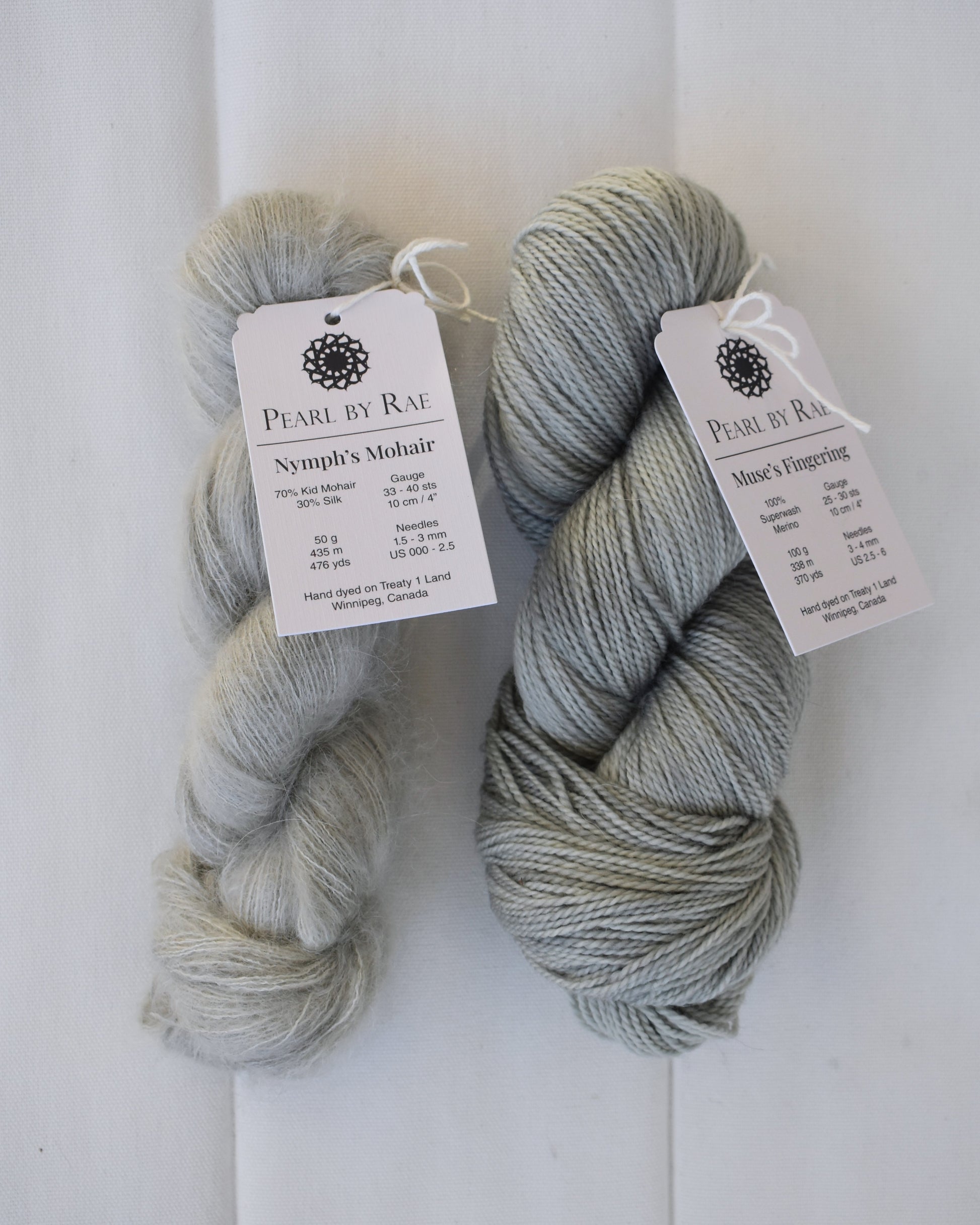 Pearl by Rae Nymph’s Mohair is wispy cloud light and soft to the touch, made of a kid mohair and silk blend. Whether paired with another base or held on its own, this yarn, tonal and hand dyed, creates a wonderful halo and provides additional structure and warmth to every piece.