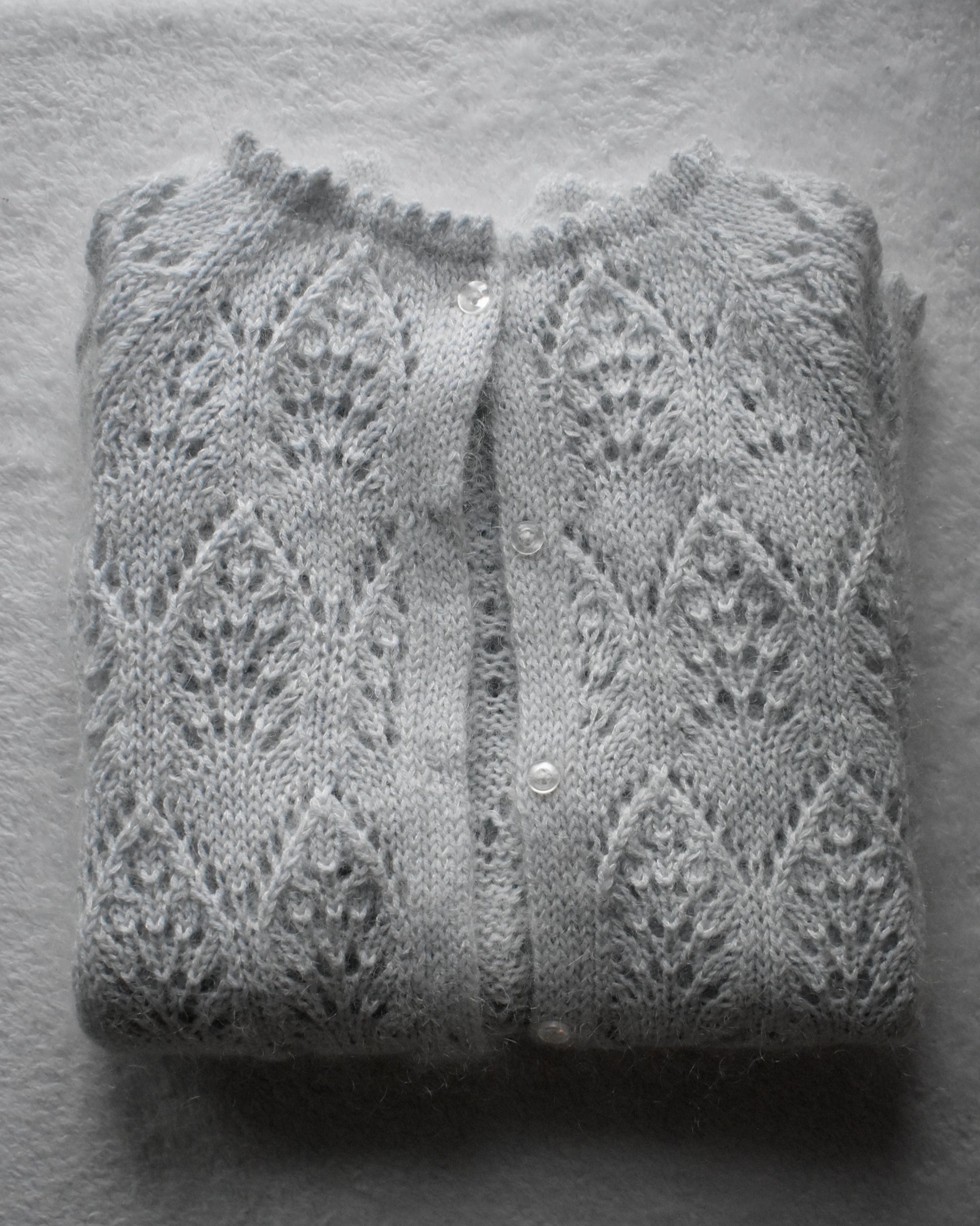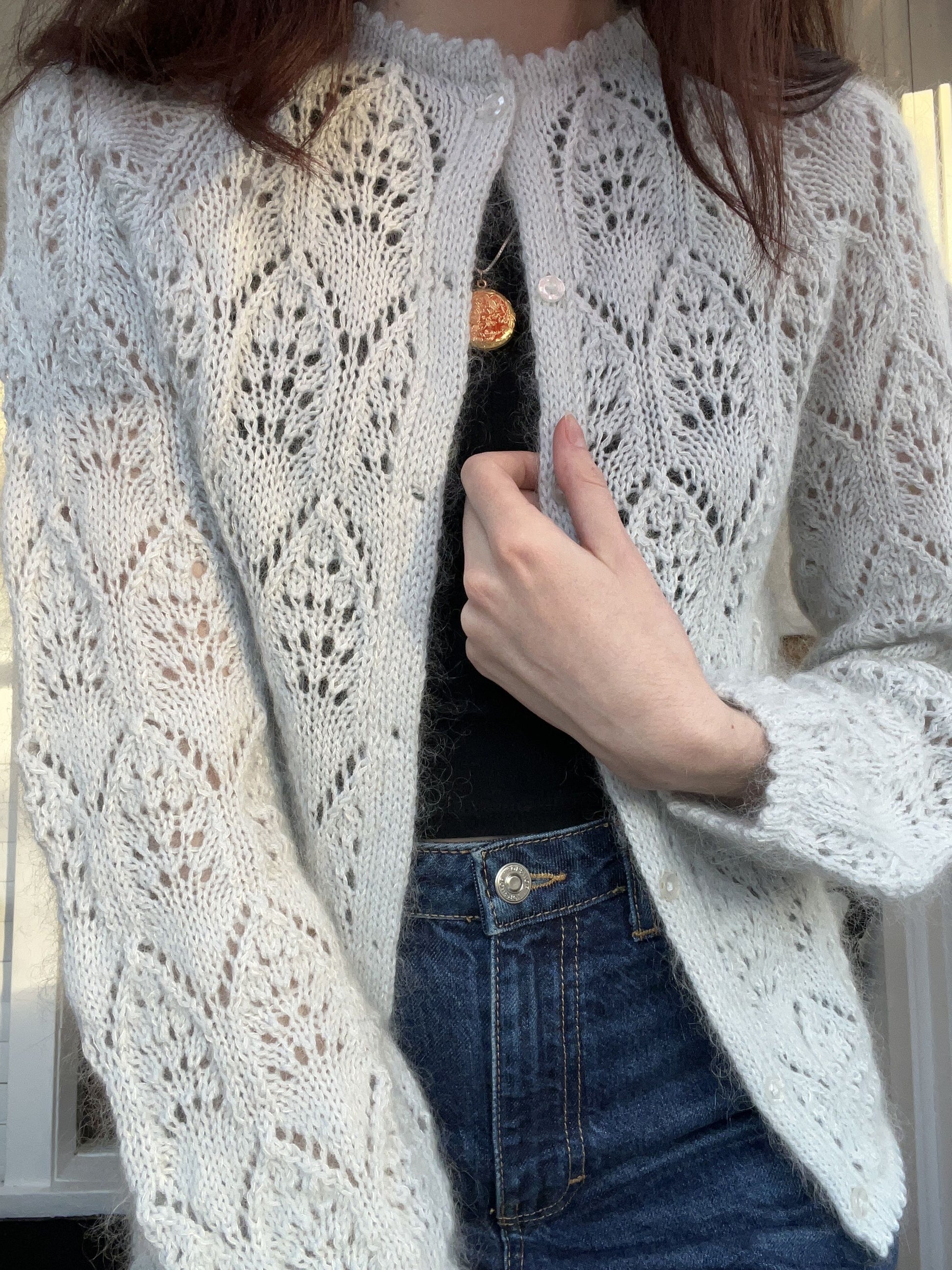 The Thalia Cardigan is an all over lace round neck raglan cardigan with slight balloon sleeves and delicate picot edge details along the hem, collar, and cuffs. This design features an elegant repeating lace motif providing an airy and light fabric, allowing the cardigan to be both breathable and warm. Due to the nature of the lace pattern, the body and sleeves of the cardigan are knit from the bottom up, jumping right into knitting lace. The sleeves and body are joined together and raglan shaping is worked to create structure to the yoke. A double knit button band is worked on either side of the body edge, and the picot edge hem and collar are worked last. The underarm seams are seamed closed and buttons are sewn to the button band to complete the cardigan.